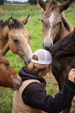 Die Pferde stehen von morgens bis abends (selbstverständlich mit Wasser und Heu versorgt) auf der Wiese oder dem Paddock.