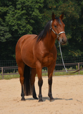 "Charly" ist eine hübsche Stute in Bay Dun. Sie ist in das EWU Jungpferdeprogramm und in die DQHA Futurity einbezahlt.